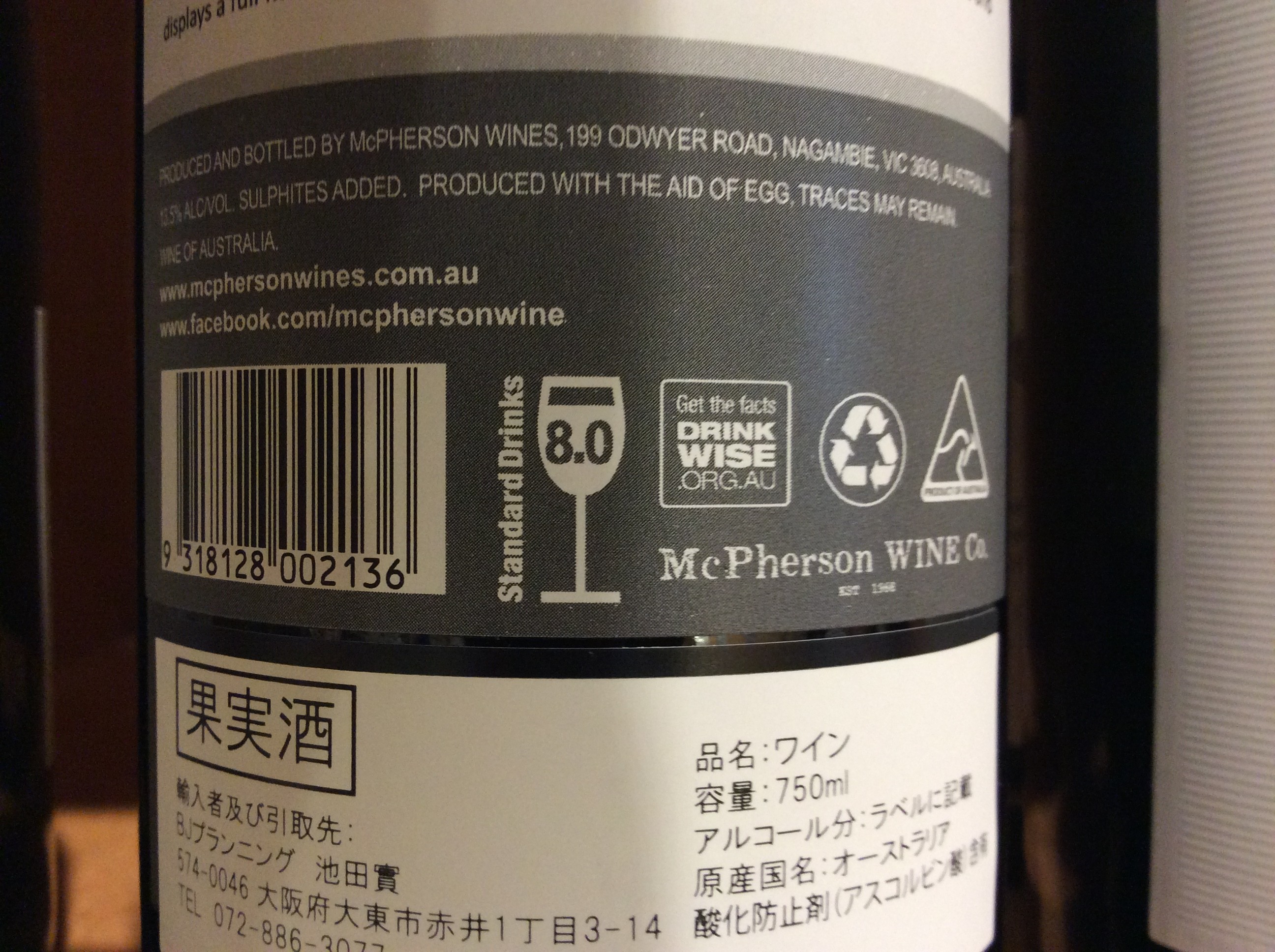 オーストラリア政府の国立保健医療研究委員会(NHMRC)がアルコールに関してのガイドラインなどを制定しています。ようするに飲酒の量として、 1日平均して男性では4スタンダード・ドリンク、女性では2スタンダード・ドリンク以上飲まない、またどれだけのんだとしても1日に6スタンダード・ドリンクを超えないようにすること。(この写真のワインは8ですから、3/4以上は1日に飲まないほうが良いらしい)